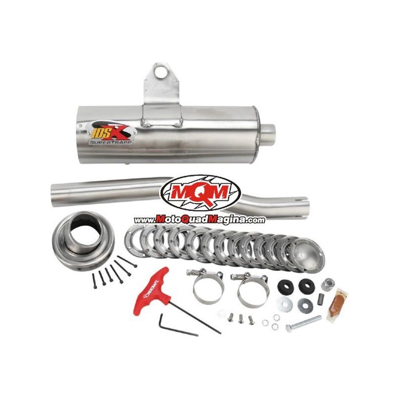 Características genéricas:- Silencioso SUPERTRAPP IDSX.- Silencioso Slip-On.- Los escapes internos de la serie IDSX son unos escapes basados en disco, que proporciona un aumento de potencia al Quad. Cuentan con una construcción de acero inoxidable que incluye cartucho, tubería de cabeza y núcleo.- La serie IDSX utiliza la tecnología patentada de disco sintonizable. Los discos ocultos de acero inoxidable están totalmente protegidos del barro y la suciedad. Empaque Pillow Pack que proporciona durabilidad y silenciamiento superior.- El uso de la pareja de discos sintonizables (con tapa de extremo cerrada) tiene la función de parachispas aprobado por el Servicio Forestal de los Estados Unidos.- Los Slip-On de la serie IDSX están disponibles para determinados modelos de Arctic Cat, Honda, Kawasaki, Polaris, Suzuki y Yamaha.